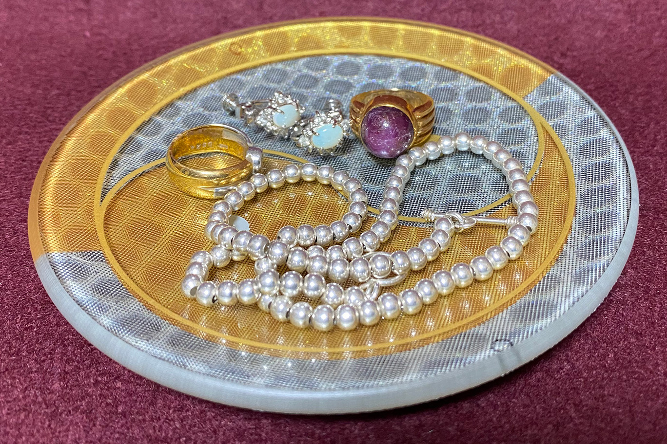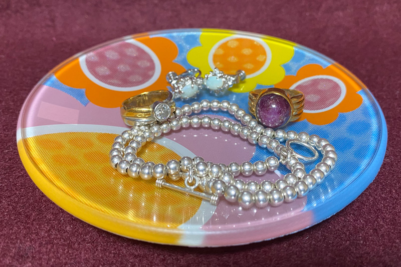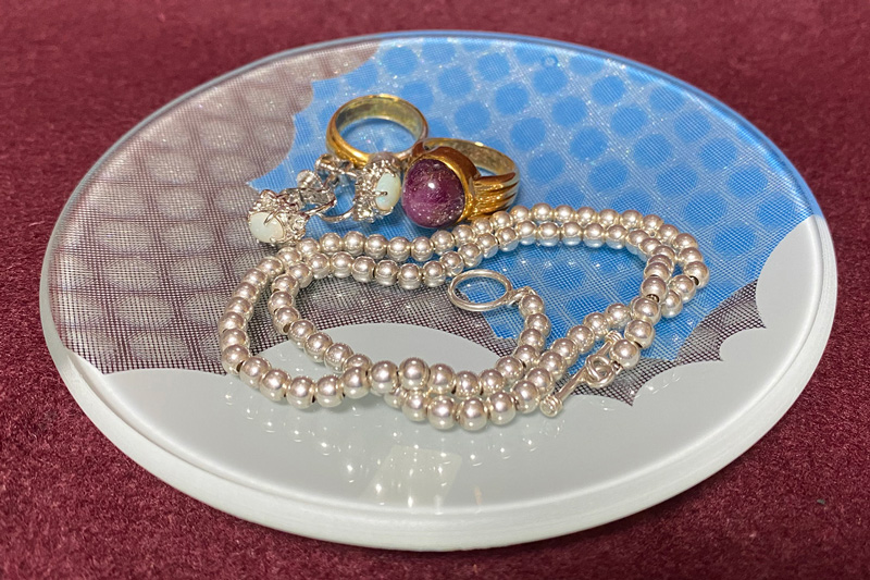 「ふしぎなお皿」は田中転写株式会社独自の特許技術を利用して、絵柄が手前に、背景が奥に立体的に見える不思議な感覚のガラス皿です。